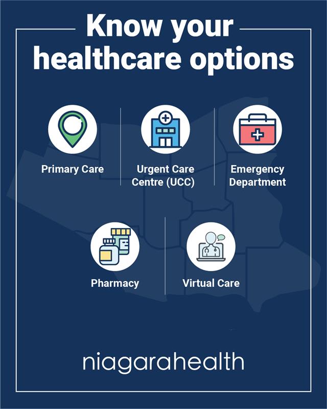 In Niagara, care is available in many forms — from family doctors and walk-in clinics, to Urgent Care Centres , Virtual Urgent Care and now pharmacies. For non-life-threatening issues such as sprains, coughs, urinary tract infections or minor allergic reactions, these options can provide faster, more appropriate care. Know your healthcare options