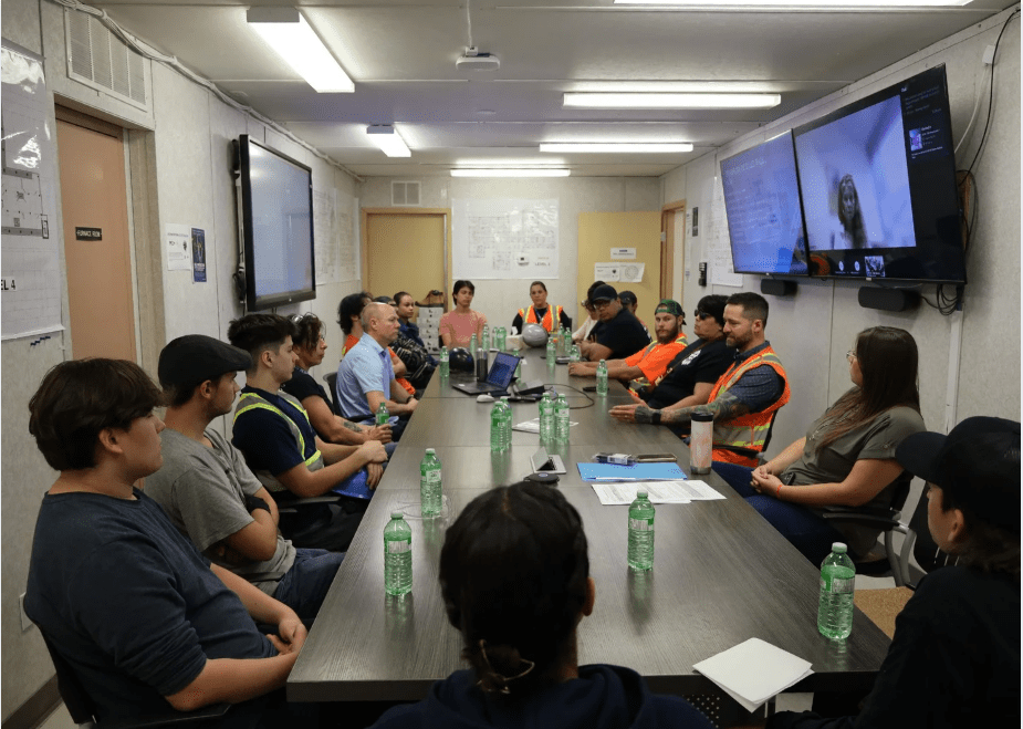 Students from the NPAAMB Indigenous Youth Employment & Training take part in a safety training session led by an EllisDon representative inside the construction trailer at the South Niagara Hospital construction site.