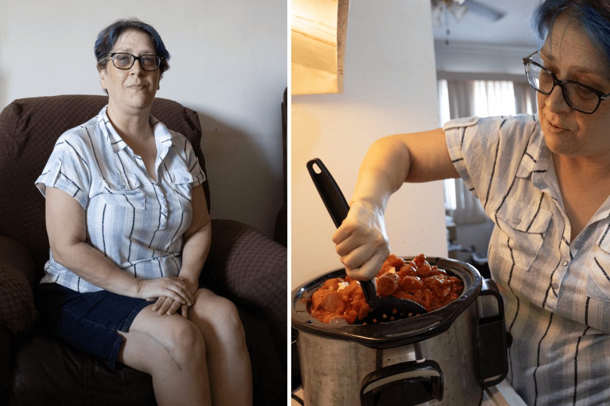 Tammy Vande Wiel sits upright with her knees bent, a simple movement she could not do a few months ago, left. Tammy Vande Wiel stirs a pot of homemade soup, a movement she is now able to do after months of physiotherapy rehabilitation and exercises, right.
