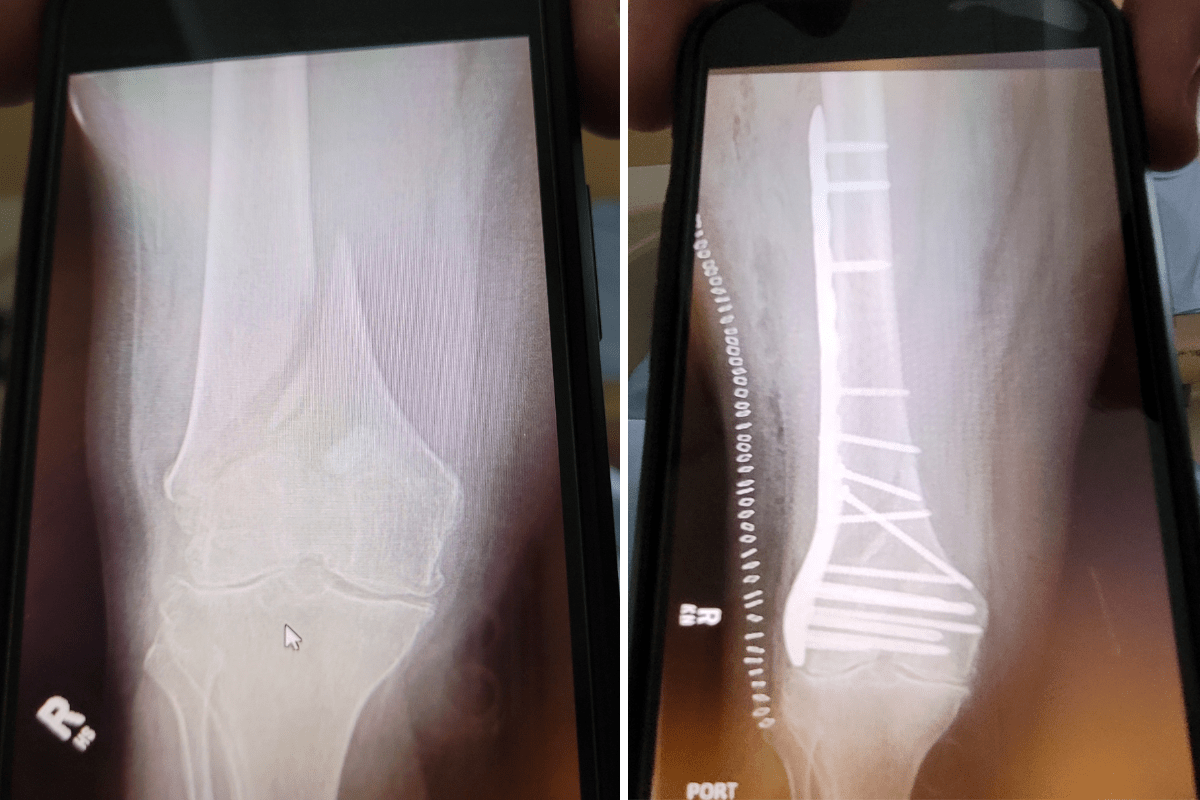 X-ray image of Tammy Vande Wiel’s femur fracture before, left, and after surgery, right.