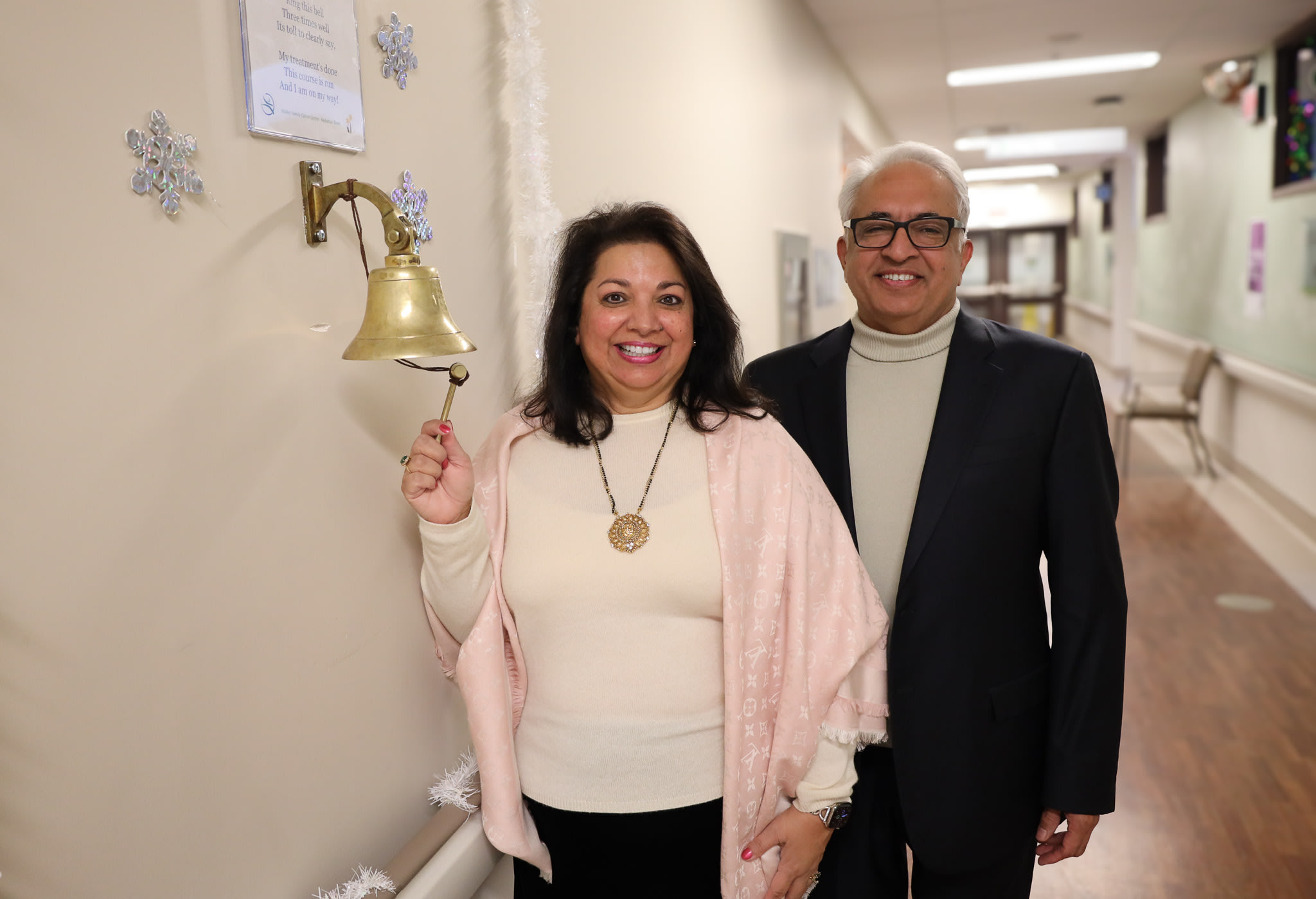 Surabhi Chawla and her husband Dr. Satish Chawla stand next to the bell at Walker Family Cancer Centre that cancer survivors — like Surabhi — ring at the end of their treatment. Surabhi carries the BRCA gene, which can predispose carriers to develop breast and ovarian cancers.