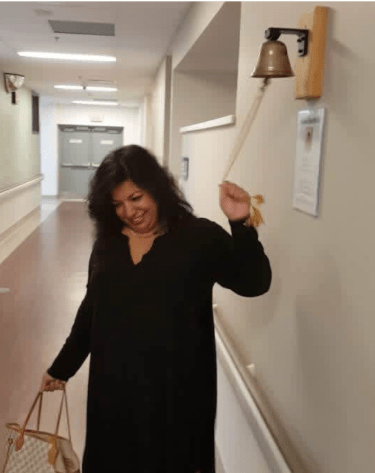 Surabhi Chawla rings the bell at Walker Family Cancer Centre to signify the end of treatment for breast cancer in 2016.